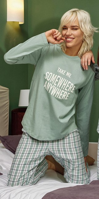 Dolga pižama iz mehkega bombaža, oblikovana za elegantno udobje. Majica z dolgimi rokavi, z okroglim izrezom in potiskom spredaj. Dolge hlače s karirastim vzorcem dopolnjujejo videz s harmonijo in stilom.