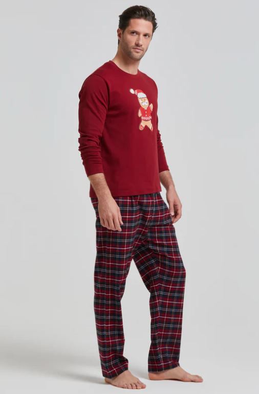 Pompea moška pižama v bordo barvi. Topla bombažna srajca in hlače iz kariraste flanele z zadnjim žepom. Enobarvna srajca ima okrogel izrez in ljubek božični potisk. Model na fotografiji je visok 188 cm in nosi velikost L.