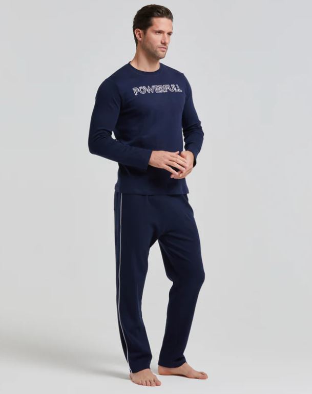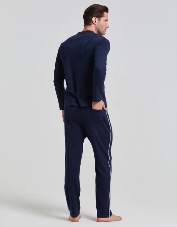 Ta moška temno modra pižama ima toplo bombažno majico in dolge hlače. Enobarvna majica ima okrogel izrez in vezenino na prsih. Enobarvne hlače imajo zadnji žep. Model na fotografiji je visok 188 cm in nosi velikost L.