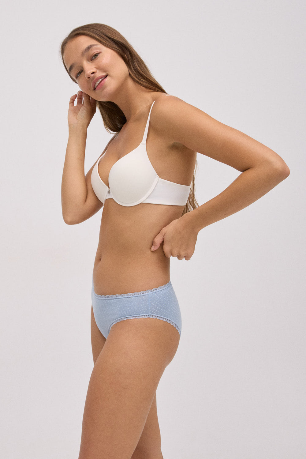 Dvojni komplet midi hlačk iz naravnega bombaža z nežnimi cvetličnimi potiski v modrih tonih in čipkastim robom. Mehke, udobne in ženstvene – popolne za vsak dan.