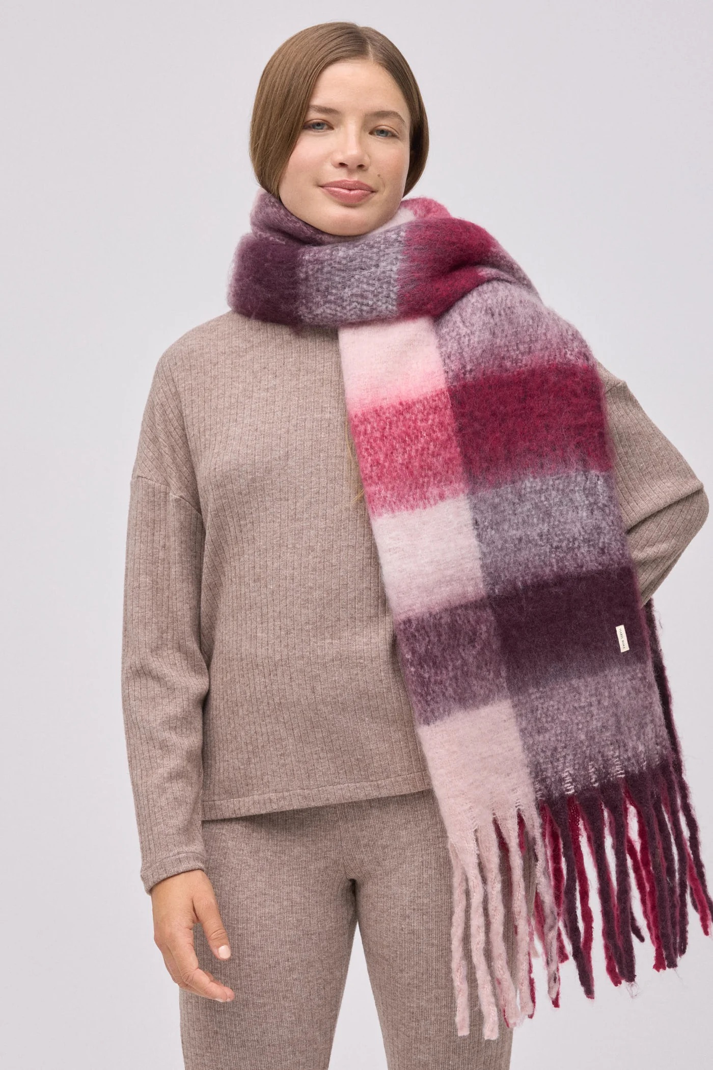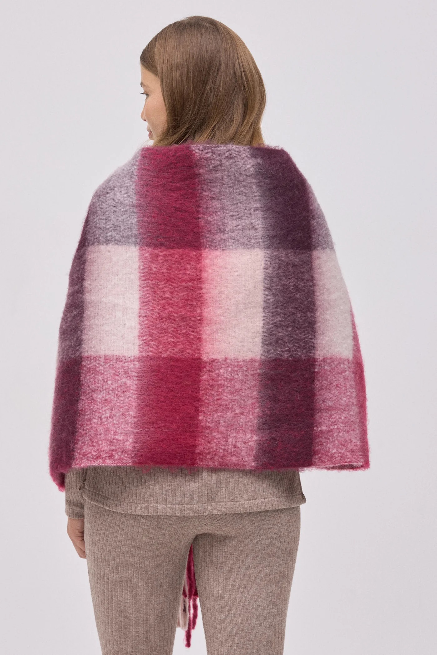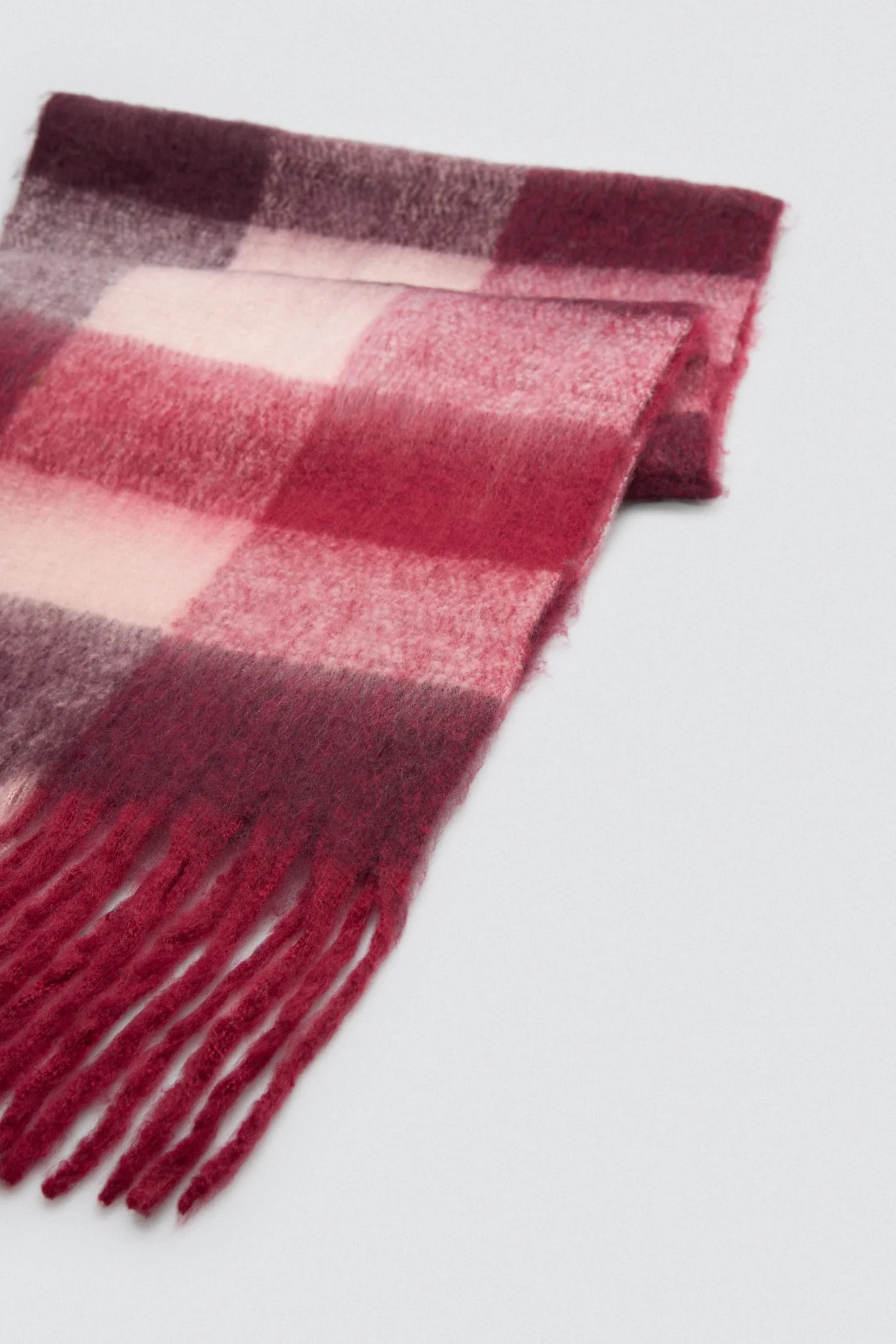 Ysabel Mora British Check – karo pashmina v bordo in rožnatih tonih
