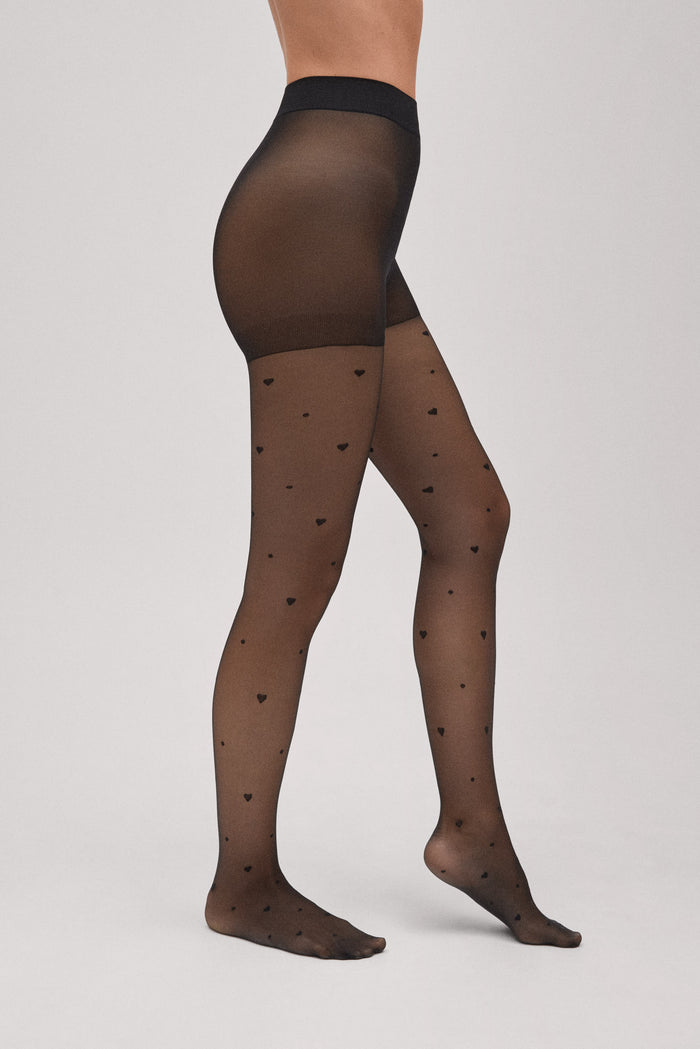 Te nežno prosojne nogavice so okrašene z očarljivim vzorcem črnih pik in srčkov, ki ustvarja ženstven, a hkrati trendovski videz.