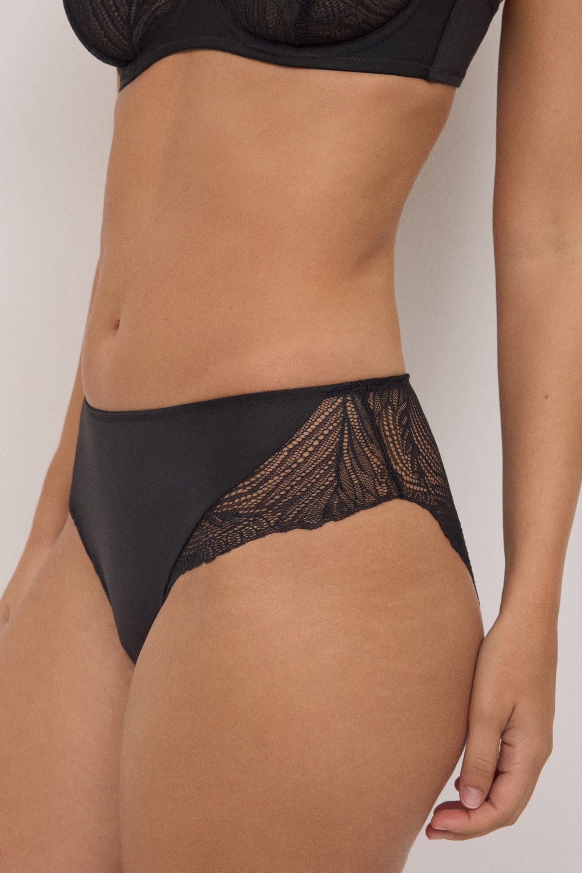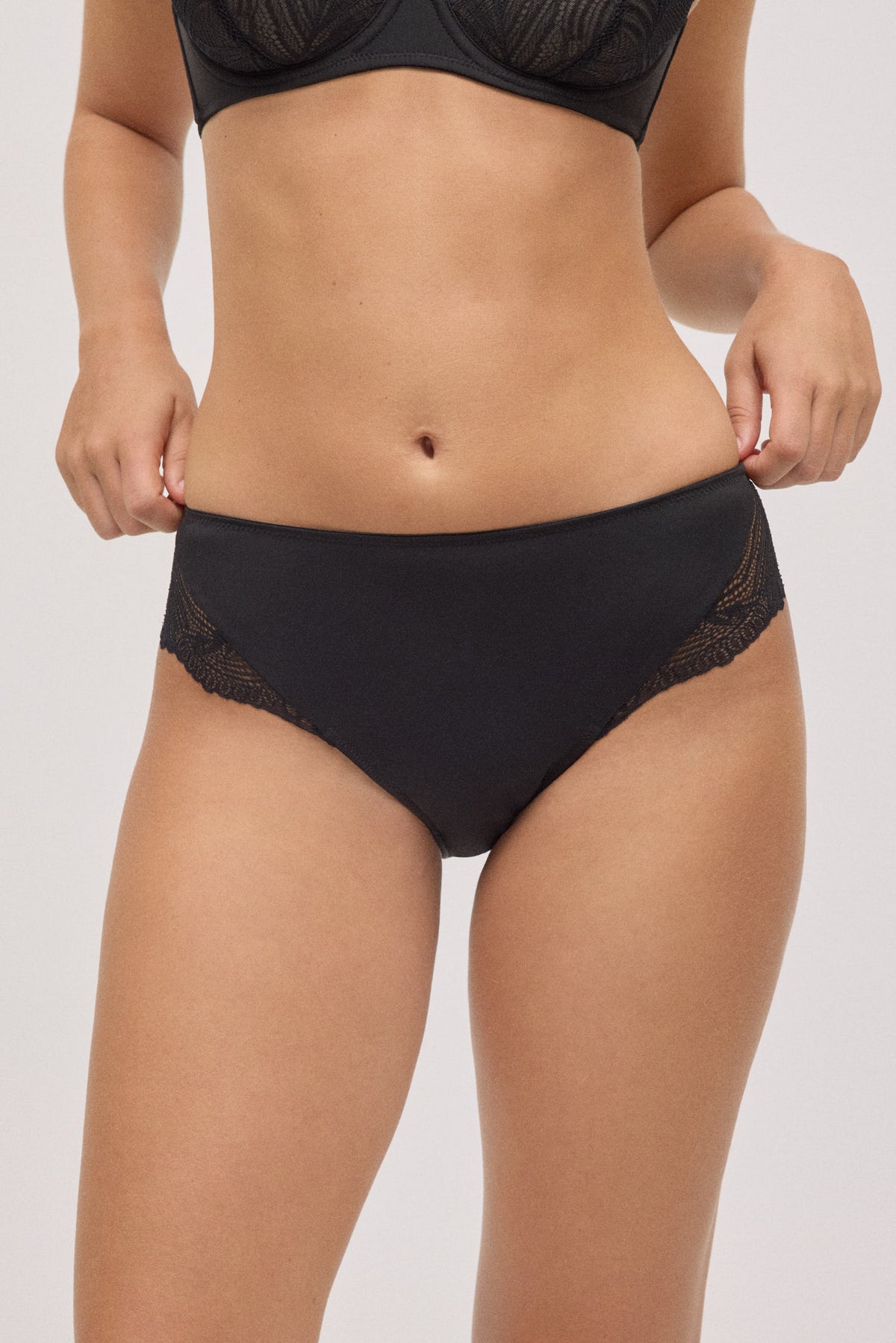 Dekorativna čipka ob robovih dodaja ženstven in eleganten videz, kroj midi pa nudi ravno pravšnjo pokritost in oporo. Popolna izbira za tiste, ki iščejo vsakodnevno perilo z občutkom razkošja.