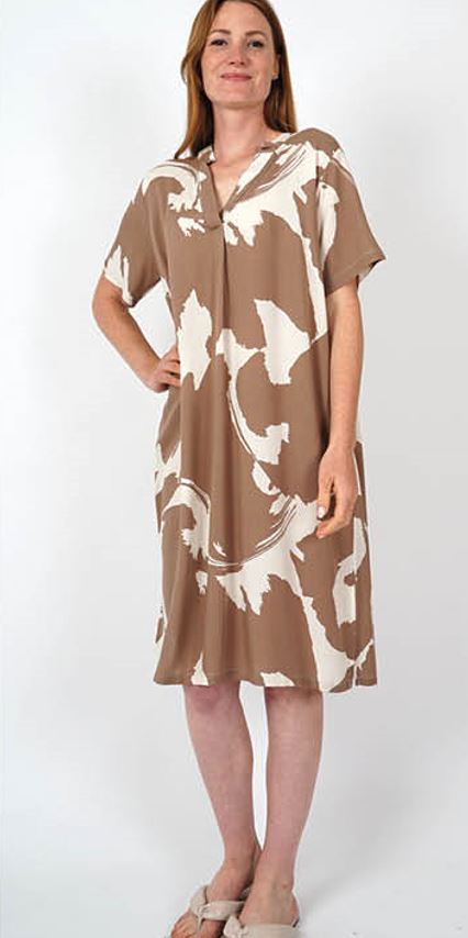 Elegantna in izjemno udobna obleka iz 100 % viskoze, ki očara s svojo mehkobo in zračnostjo. Obleka ima V-izrez, ki lepo poudari vratni izrez, ter kratke rokave, ki poskrbijo za sproščen in poletni videz. Dolžina do sredine stegen ustvarja ženstveno silhueto in omogoča lahkotno gibanje.